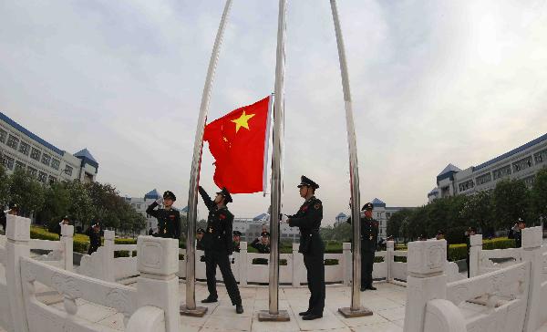 7点整,升旗仪式开始,伴随着雄壮的国歌声,鲜艳的五星红旗冉冉升起,在场的全体师生面向国旗肃立行注目礼,用心感受着国旗升起的庄严时刻。随后,来自外国语学院的刘牧星同学做了《青春宣誓》的主题发言,抒发了当代学生勇于担当的历史使命感和励志成才的进取精神,展示了我校青年学生积极向上的精神风貌和高尚的道德情操,全体团员青年在刘牧星同学的带领下,重温了入团誓词。