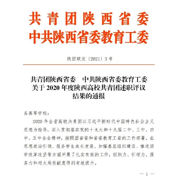 近日,陕西省高校共青团工作2020年考核评选结果揭晓,我校荣获“2020年陕西高校共青团工作优秀单位”。